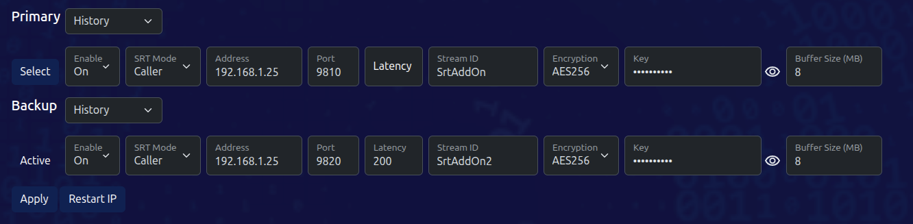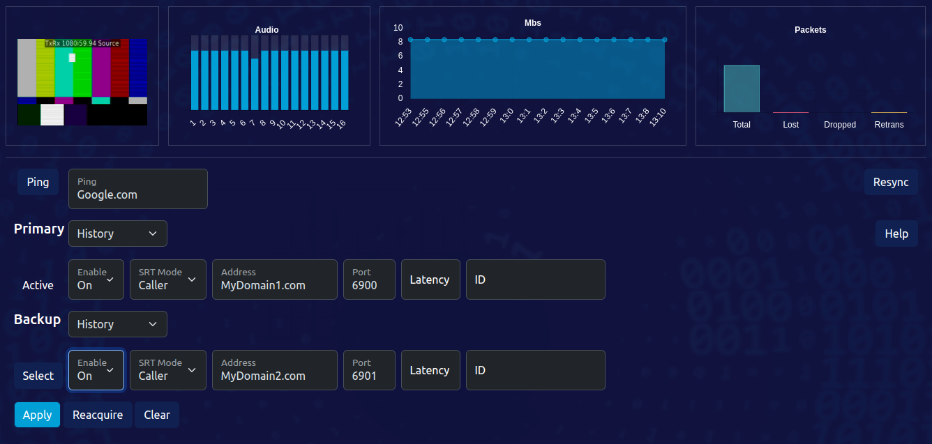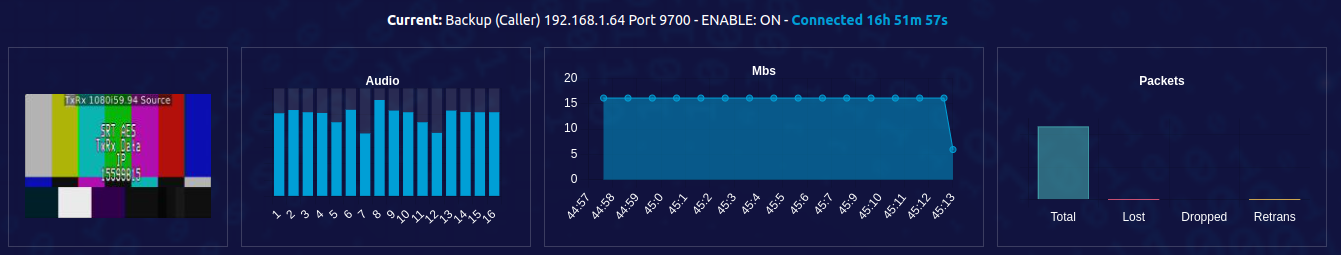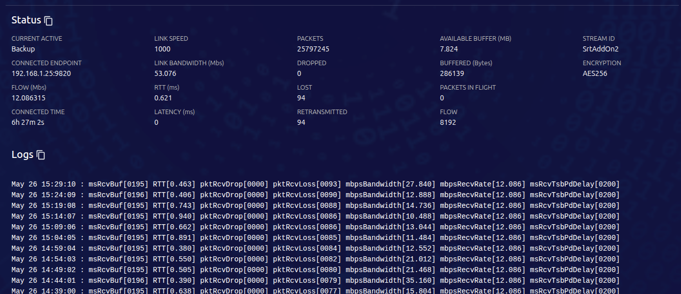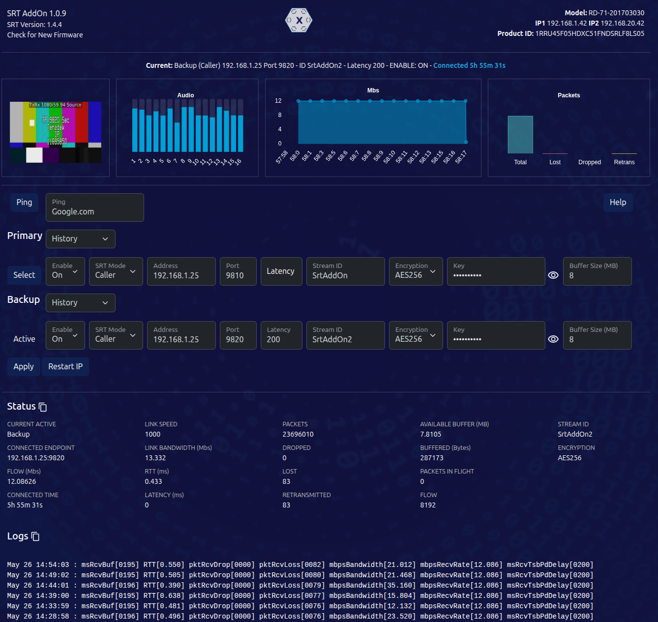Release 1.0.9 now adds more resilient Primary and Backup SRT URL Redundancy, user defined Buffer size and Packets in Flight and enhanced SRT and network Statistics including Link Bandwidth and expanded Logging.